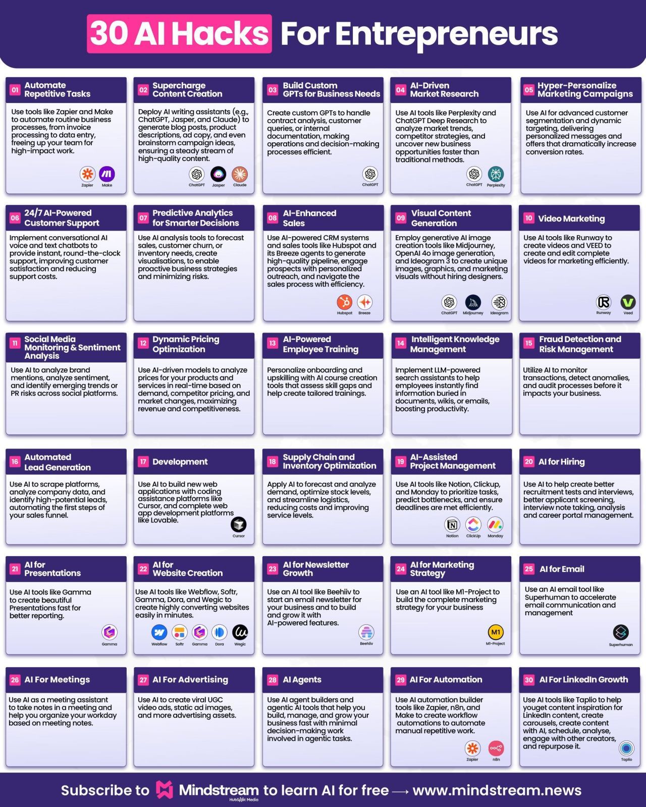 Luckily, I stumbled upon this incredible list from an industry pro who shared 30 AI hacks to crush that wasted time. It’s an absolute game-changer, and I think it’s too good not to share.